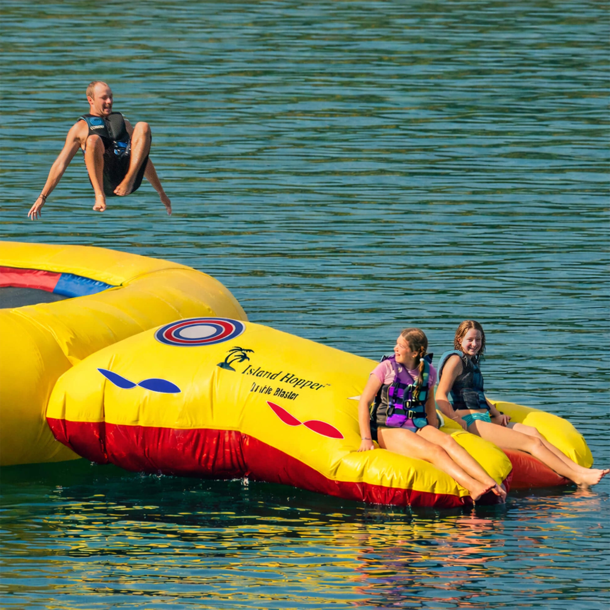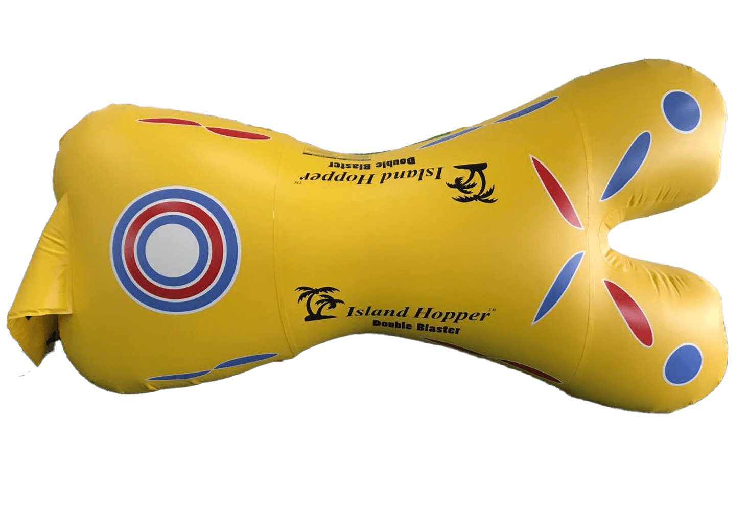 The Island Hopper Double Blaster Water Trampoline attachment is the ultimate launching pad for water trampolines and water bouncers, sending riders flying into the water with nonstop laughs. Designed to take water fun to new heights, it’s the only blaster in the industry built for two users at the same time, delivering double the excitement with every launch. The Double Blaster attaches securely by wrapping straps around the tube and cinching them tight for a stable, reliable fit.