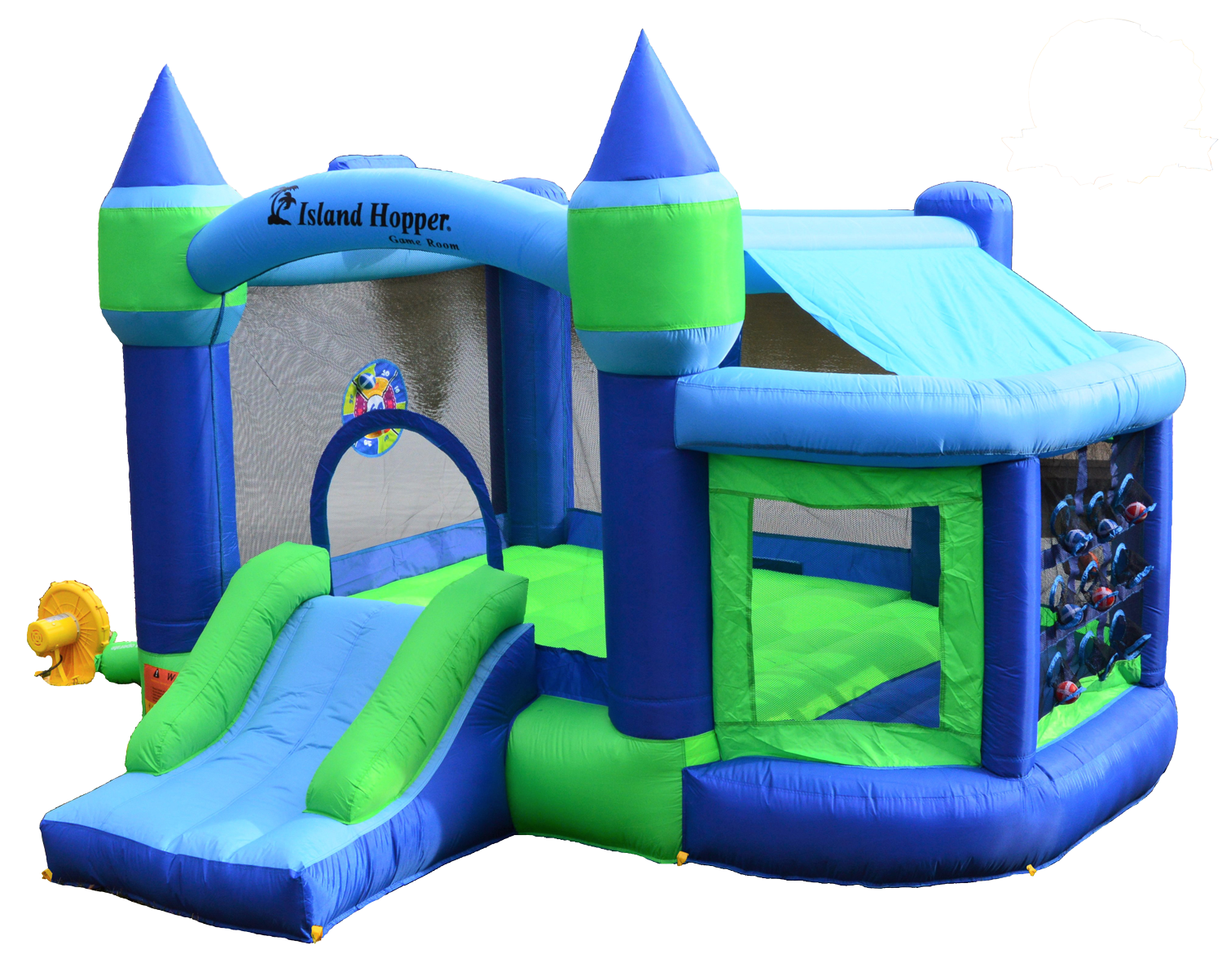 This durable continuous air flow product offers a Tic-Tac-Toe game, a Velcro target ball throw, a basketball slam dunk, a fun exit slide, and a shaded side play room with padded inflatable floor. The Shady Play Game Room Bounce House assembles and inflates in seconds. It is ideal for active little people who like games and need a shaded place to play and jump. Use it outdoors, or on rainy days bring it indoors.